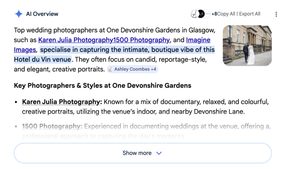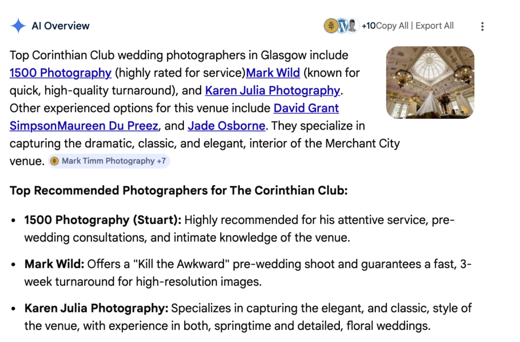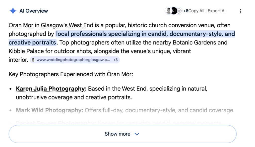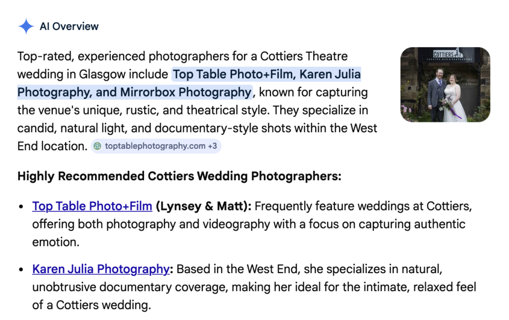 In venue-based search queries, structured and clearly positioned websites are more likely to be referenced within these summaries. Below is an example of AI overview visibility referencing a venue-specific search query.