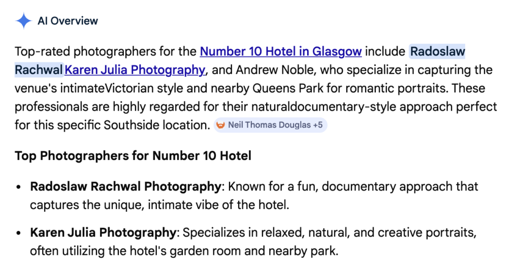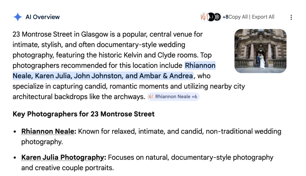 These are some AI overviews that I’ve been able to achieve for my Karen Julia Photography brand.